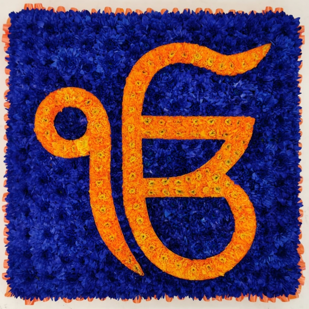 Ek Onkar the Sikh religious symbol is created using a 2 foot x 2 foot designer board and dyed double chrysanthemums, by our skilled florists at Buttercups & Daisies Florist Birmingham