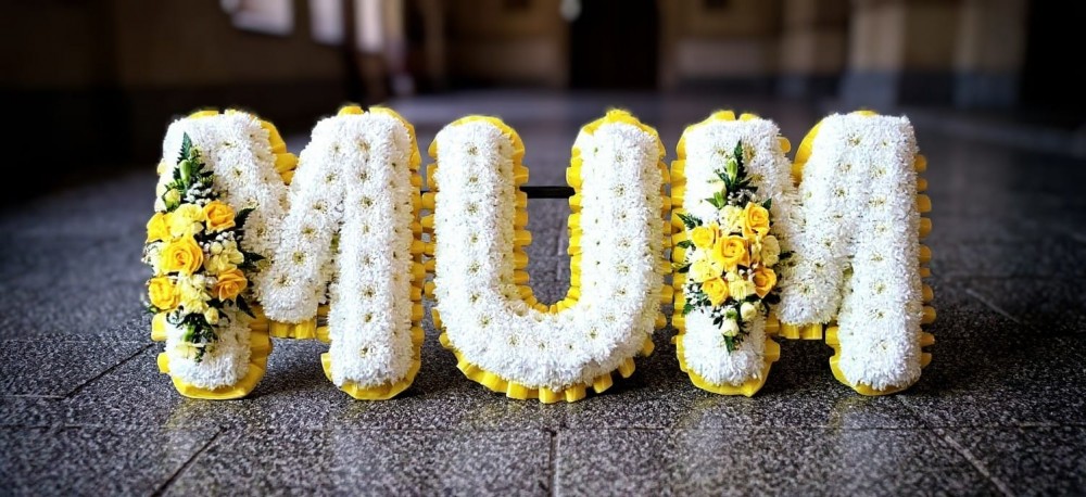 Mum funeral tribute. A double row of ribbon (colour of choice) massed in white chrysanthemums, with sprays of spray roses and carnations and gypsophillia (colour to match ribbon)